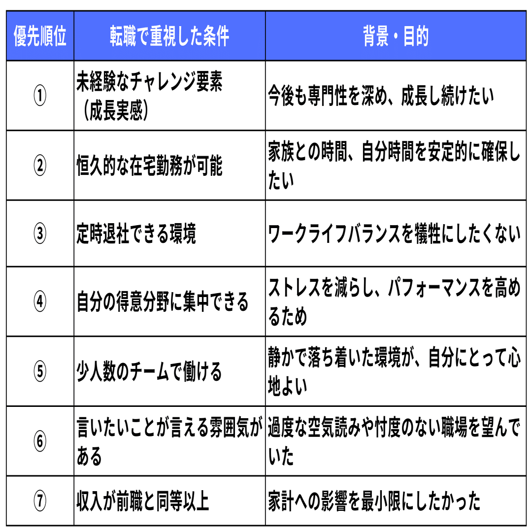 この軸に照らして、「転職先に求める条件」を以下のように整理しました。