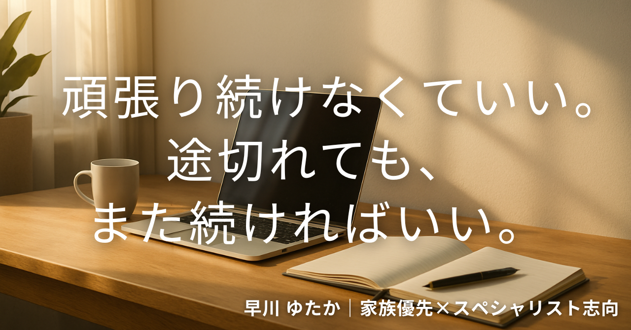 努力が「頑張り続けること」だとしたら、継続とは「途切れそうになっても、つなぎ直すこと」なのだと思います。
